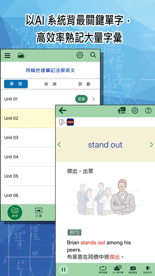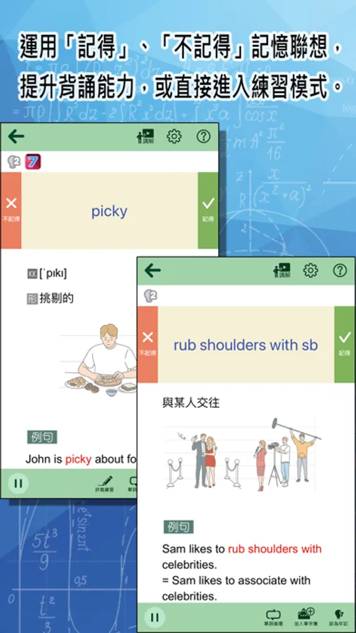 【背誦 / 學習雙模式】:「背誦模式」系統化地背單字,逐步成為長期記憶;「學習模式」可進行系統外的複習。