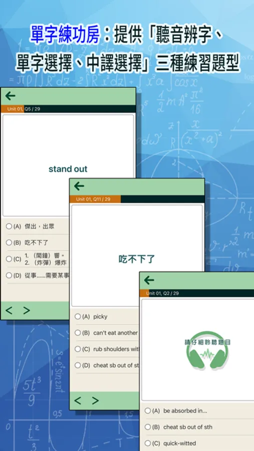 【單字練功房】:提供「聽音辨字」、「單字選擇題」、「中譯選擇題」三種練習題型,提升學習成果。