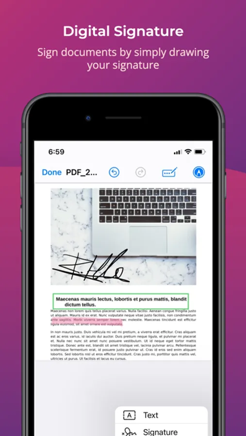 - Sign documents by simply drawing your signature on the document or using your saved digital signature