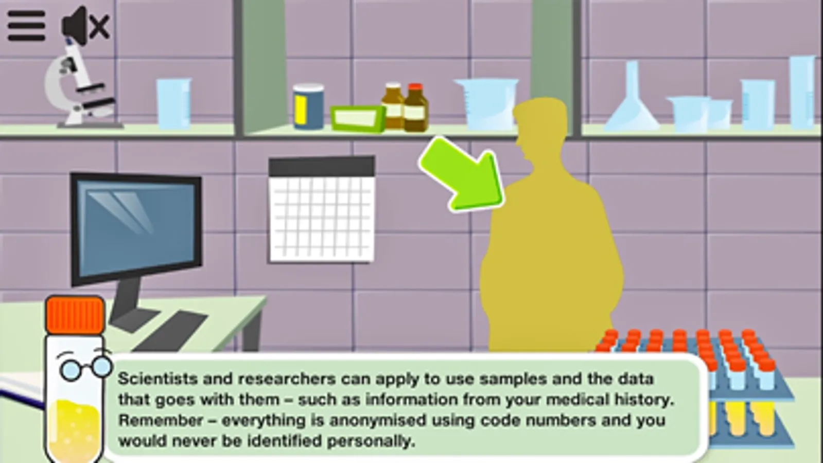 ‘Sammy the Sample’ is your guide and he will take you on a journey from hospital clinic to biobank to research lab. Along the way he’ll show you the impact that research using donated samples has made on patient care today. He’ll also test your knowledge – that's the game part. The game is easy to use and can be played in several sessions.