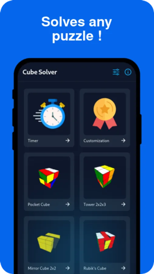 - Pocket Cube, Mirror Cube 2x2 and Tower Cube 2x2x3 : this app can solve the cube in 14 moves or less !