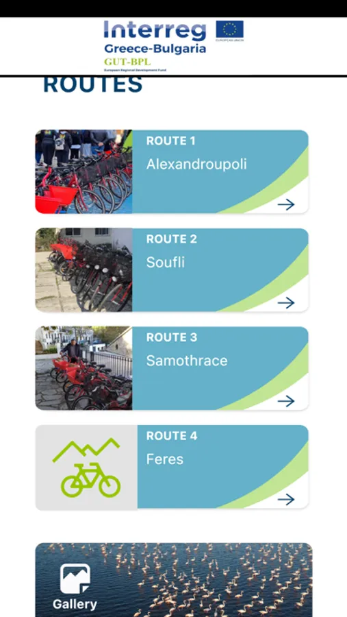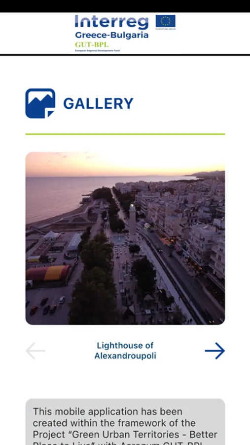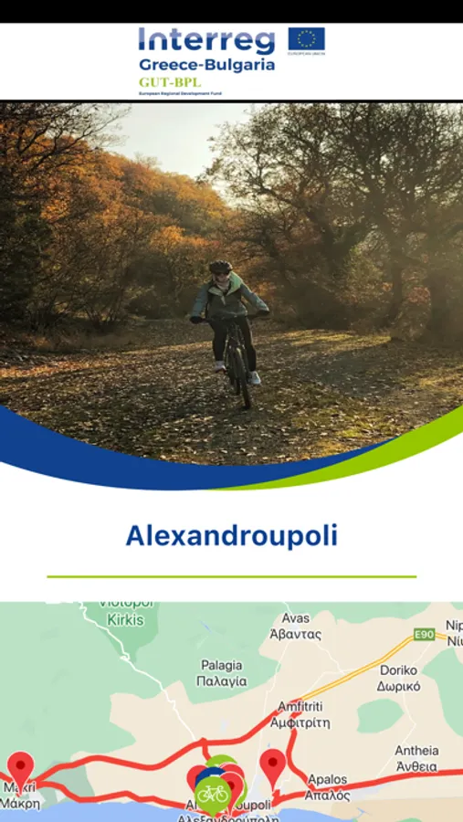 App containing information concerning the area of GUT-BPL project (Municipality of Alexandroupoli, Municipality of Soufli and Municipality of Samothrace) and environmentally friendly routes with dynamic maps, including bicycle stations, as well as car charging stations. The app, additionally to the routes and several points of interest around the routes (points of natural environment, landmarks, stations, etc.), includes essential information about the GUT-BPL project, a link to the project website, and information regarding the project beneficiaries. In addition, the user can browse through photos of the area. Moreover, the app includes studies (research on agriculture practices and the development of green initiatives for the areas of Alexandroupoli, Soufli and Samothrace), as well as the rest deliverables of the project.