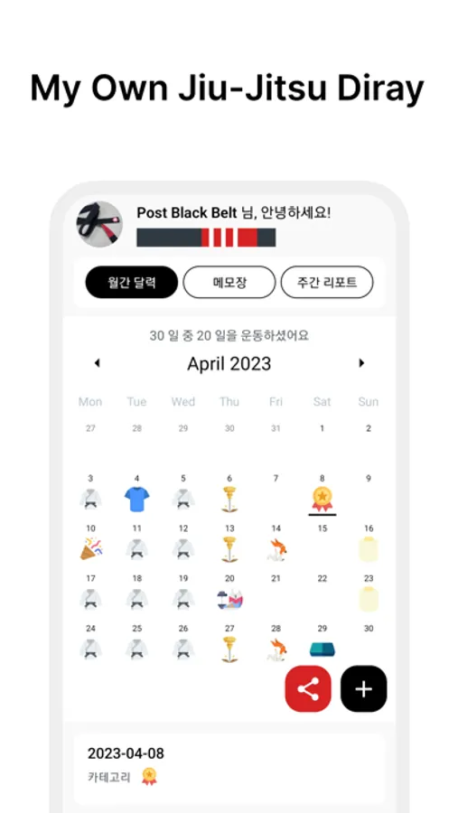 Record your daily exercises and categorize them by technique to assist you on your journey to discovering your own Jiu-Jitsu style.