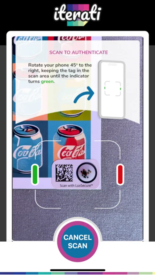 A quick and easy camera based scan sequence can validate the authenticity of an Iterati tamper-proof label as well as retrieve information about the associated artwork that has been enrolled using the Iterati physical authenticity platform.