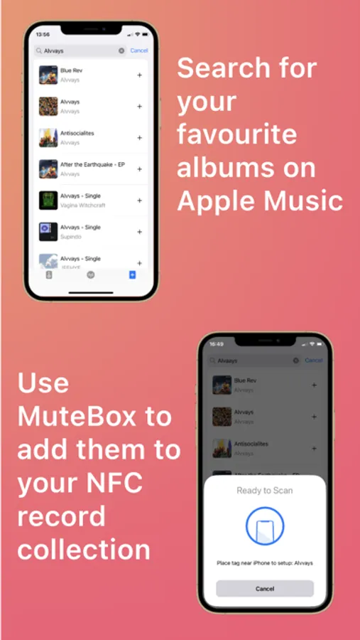 With MuteBox, you can explore Apple Music's extensive library and effortlessly register your beloved albums to NFC items such as cards, stickers, or tags with a simple tap. Just like the nostalgia of inserting a CD into a player, bringing your NFC item near your iPhone will instantly play the album linked to that tag. Switching between albums is a breeze with another quick scan.