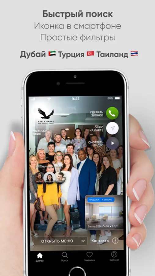 В приложении Вы быстро определитесь с локациями, выберите подходящий вариант, свяжетесь с понравившимся агентом и найдете ближайший офис.