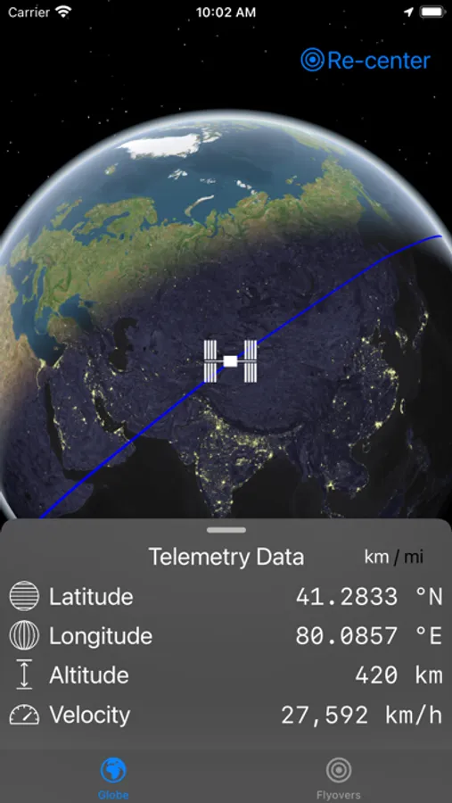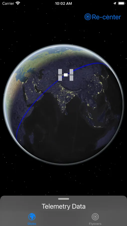 See the live location of the ISS and its orbit mapped to a globe. The orbital trajectory for approximately one full orbit is displayed and updated in real time, along with telemetry data, including latitude, longitude, altitude and speed (in miles and kilometers).
