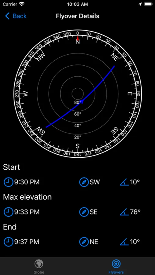 Easily locate the ISS in the sky using our intuitive compass view. With azimuth (compass direction) and elevation (degrees above horizon) details for the start, maximum elevation, and end points of each flyover, spotting the ISS with the naked eye has never been easier!