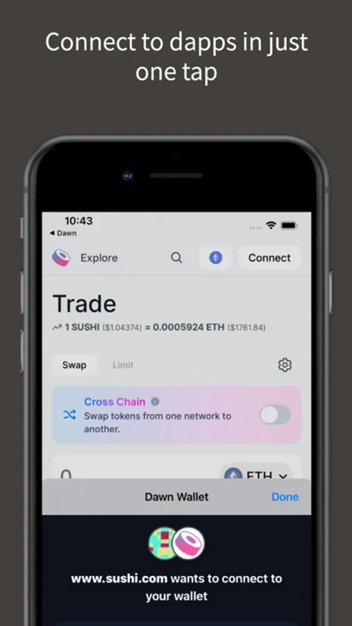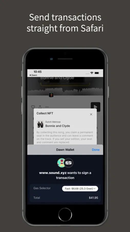 With its native Safari extension, Dawn allows seamless integration with your favorite browser, ensuring you have secure access to the rapidly expanding world of decentralized apps (DApps) such as Uniswap, Aave, Sound.xyz and many more.