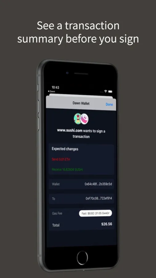 1. Self-custody wallet: Dawn never has access to your funds. They are stored securely by your iPhone, using the Keychain and Apple Secure Enclave chip for advanced security.