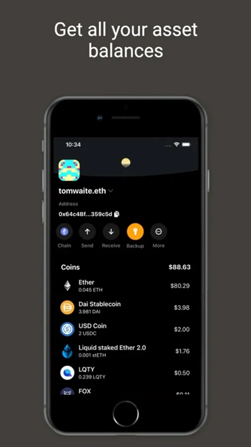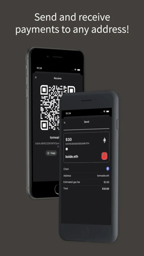 6. Send/Receive Crypto: Transfer and send cryptocurrency to friends easily via their ENS name and QR code.