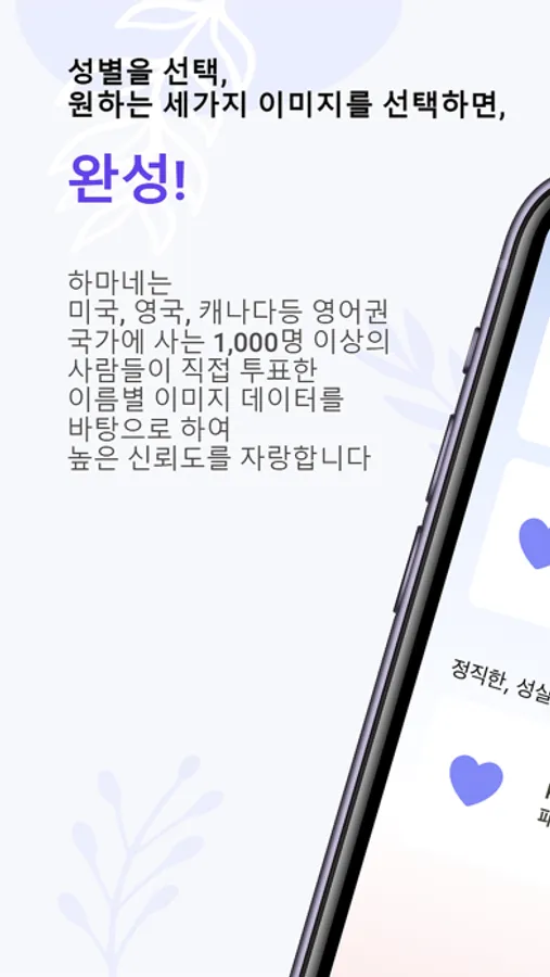 하마네의 정교한 데이터베이스는 미국,캐나다등 영어권 국가에 사는 1,000명 이상의 사람들이 직접 투표한 이름별 이미지를 바탕으로 구축되었으며,영어권에서 가장 인기 많은 2000개 이상의 이름들을 성격 이미지 별로 (3개 이미지의 조합) 검색 하실 수 있습니다.