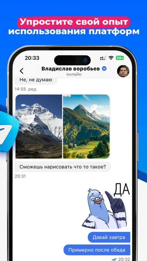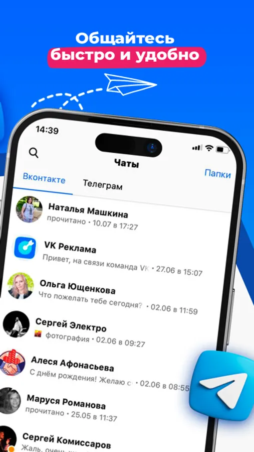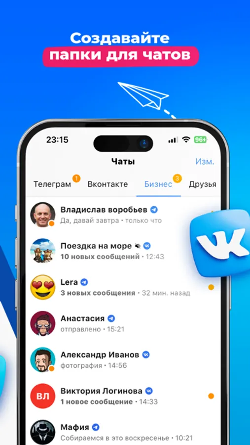 1) Nodegram объединяет чаты из ВК и Телеграмм в одной папке. Это позволяет уменьшить хаос в вашем списке сообщений и упростить переписку.