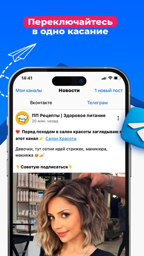 2) Общая новостная лента Телеграмм и ВК. Вы можете легко переключаться между соц сетями, не переходя в другое приложение.