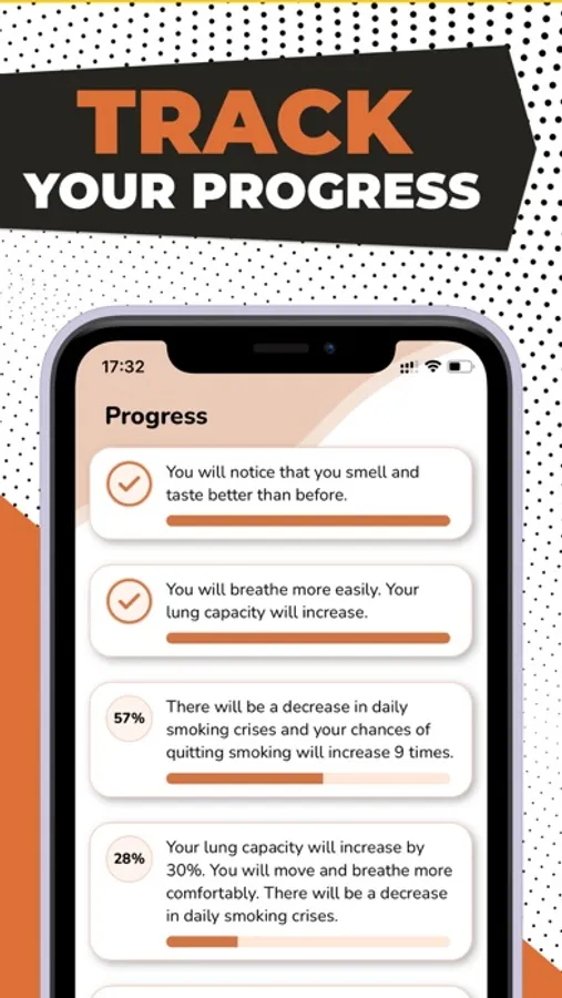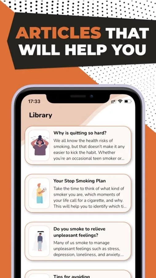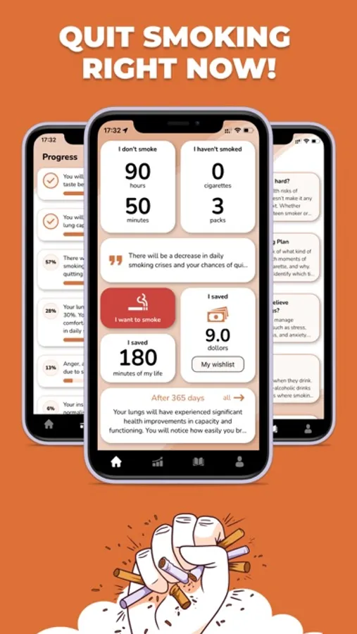 The Quit smoking app Helps you combat the side effects of smoking cessation with strategies to resist the urge to smoke. Now you can finally say goodbye to cigarettes and e-cigarettes!
