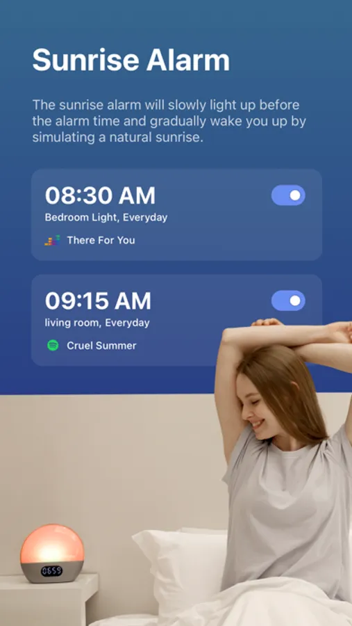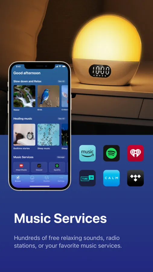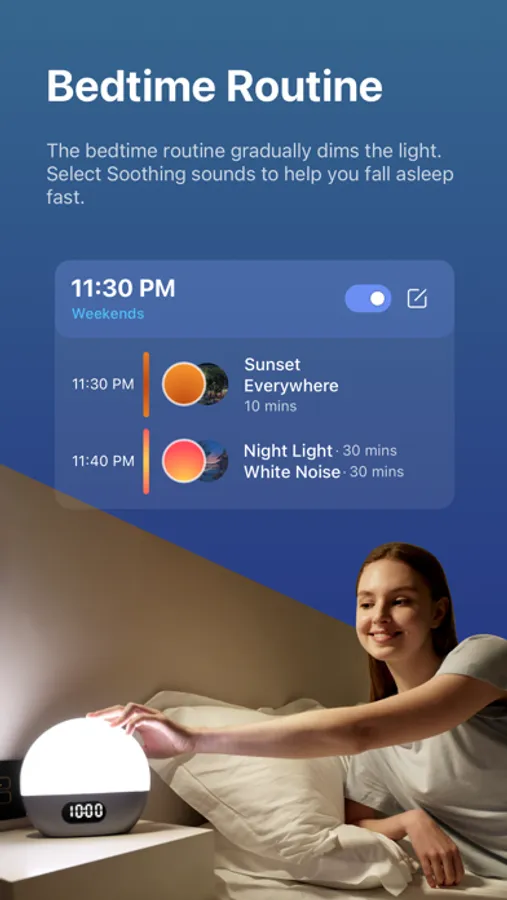 · Pair your wake-up and sleep routines with your favorite songs, radio stations, or podcasts.