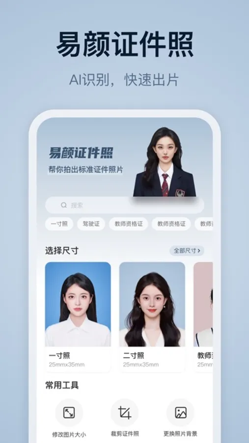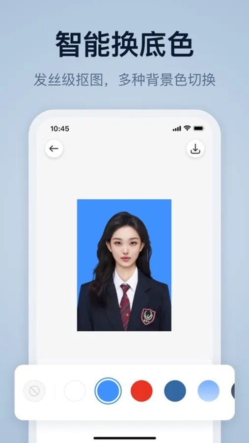 一寸证件照、学生证件照、工作证件照用手机随时随地就能制作!一键更换证件照底色,多种背景色可选!