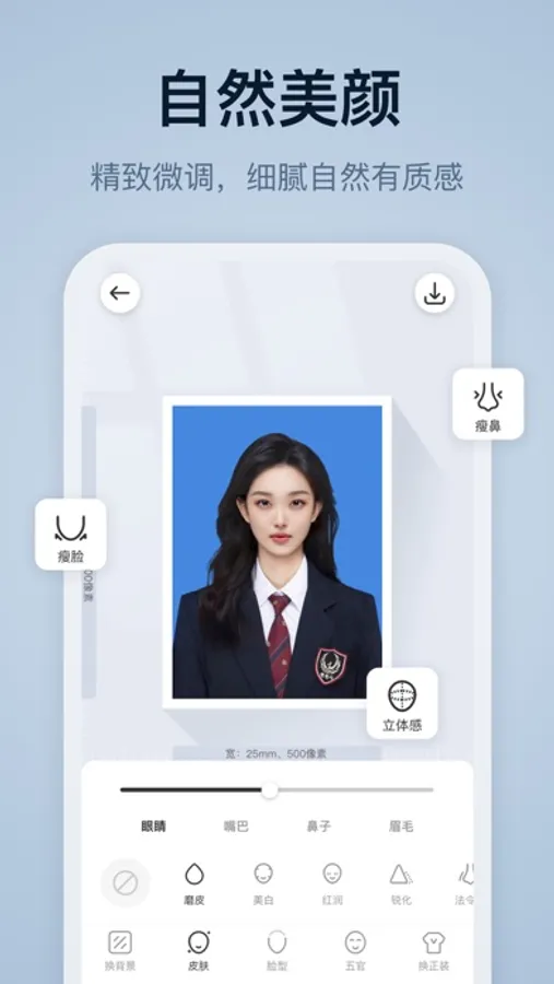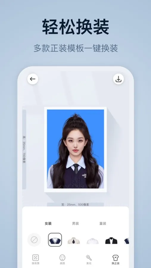 这是一款专业、简单、方便的证件照制作软件!上百种系统专业尺寸库、快速背景替换、一键智能美颜,轻松为你拍出专业、合格的证件照。