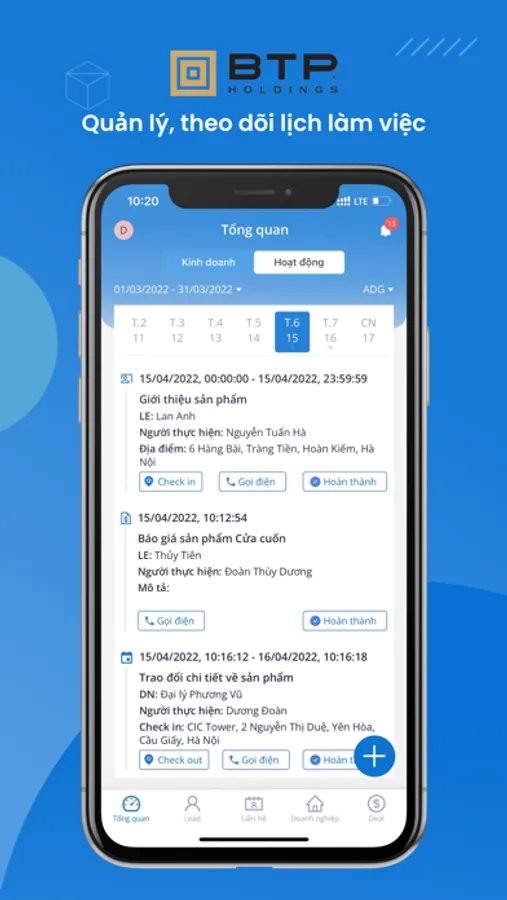 Ứng dụng cho phép người dùng tạo ra các nhiệm vụ/ cuộc hẹn với khách hàng, với vai trò quản lý có thể giao nhiệm vụ cho nhân viên. Từ các nhiệm vụ/ cuộc hẹn được khởi tạo, BTP-CRM sắp xếp và hiển thị nhiệm vụ/ cuộc hẹn đó theo thời gian trong ngày.