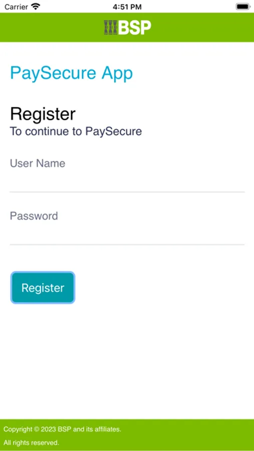 You must be an existing BSP customer and/or have been issued a username and password to register for BSP PNG PaySecure. Log in with these credentials. Upon login, you will need to create a 4-digit PIN that you will always use to access the app. This completes the registration process. After completion of transactions, always log out.