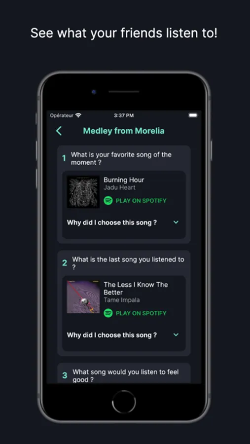 The app offers a variety of pre-made lists of questions, ranging from music preferences to life experiences, that you can choose from. Once you have created a list, you can send it to any user and wait for them to respond with the songs that come to their mind based on the questions you chose. As you receive responses, you can listen to the music and give your feedback, and have meaningful conversations about it.
