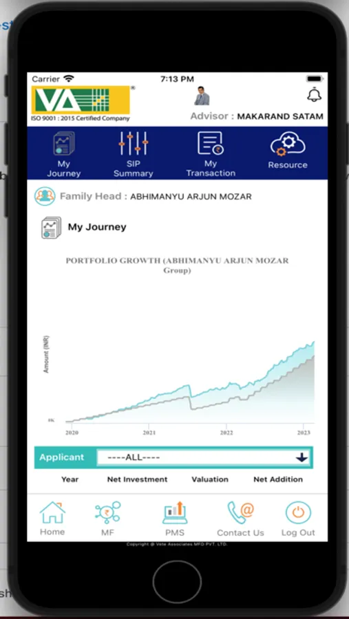 After successful login, the Welcome screen displays the ‘Dashboard’ where client can view the Consolidated investment report of their family. Upon Clicking on members name, client can track the individual investment performance of the member.