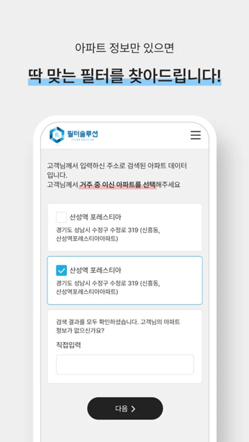 전국 3천개 이상의 아파트 데이터베이스를 바탕으로 수천가지 이상의 필터 타입을 맞춤으로 제작하고 있으며 필터부분 네이버 스마트 스토어 1위를 하고 있는 업체입니다.