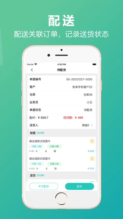 配送货管理:配货管理、装车管理、验货管理、送货管理、交账管理