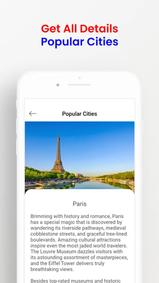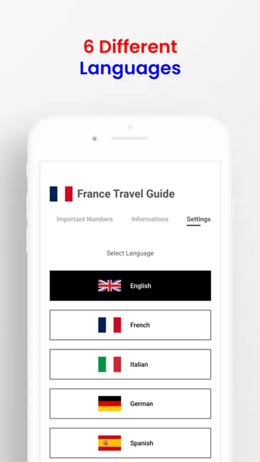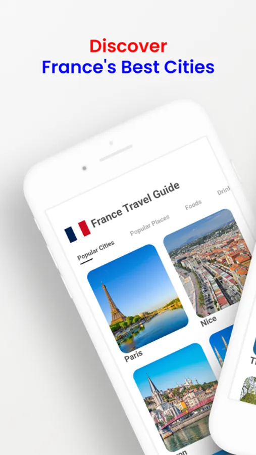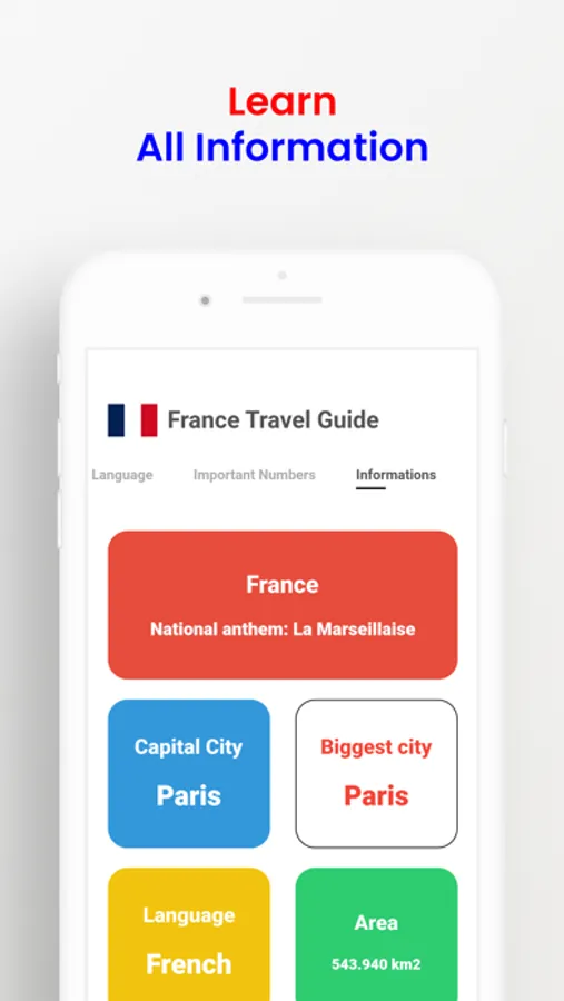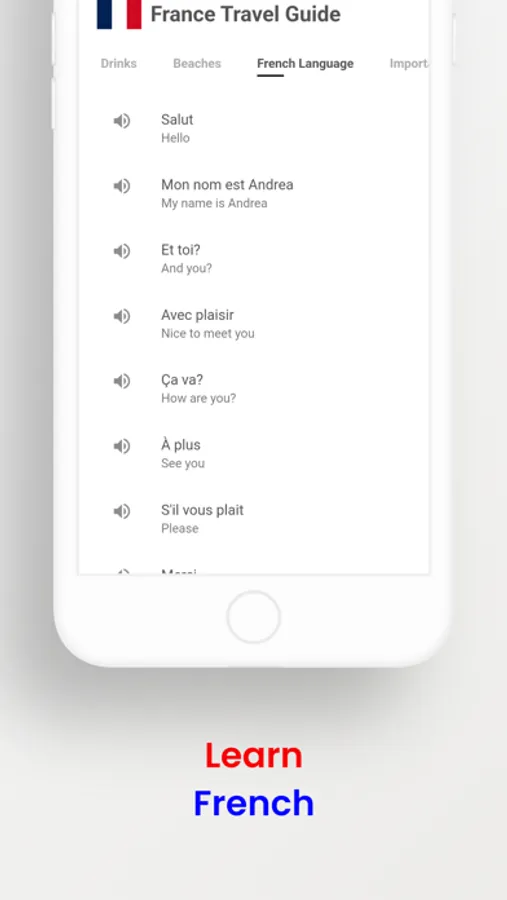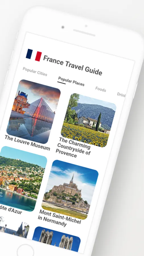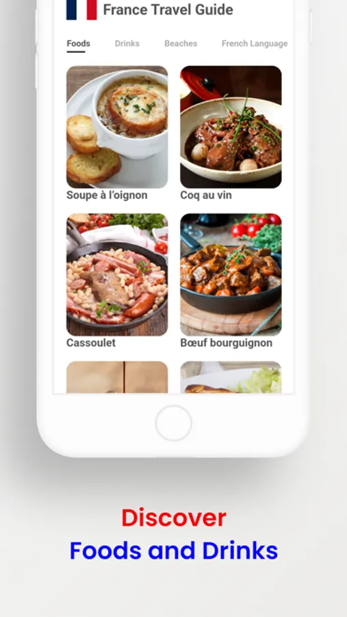 The sections in the application are: France's popular cities, France's popular places, Best French Foods, Best French Drinks, Best Beaches in France, Learn French Language, Informations about France and Important Numbers in France.