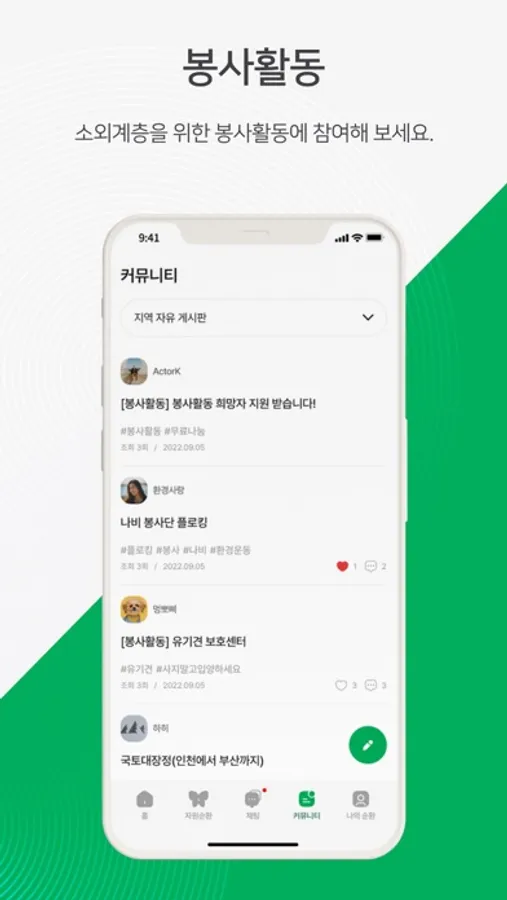 - 나비의 커뮤니티 안에서 재능기부, 봉사활동 등을 의뢰/기부 등의 기능을 지원합니다, 나비 플랫폼을 통해서 사회적 활동에 참여해 보세요!