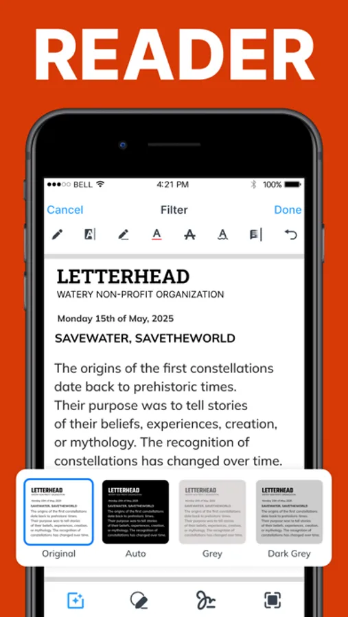 All Document Reader also makes it easy to edit documents right in the app. You can add text, images, and shapes to your documents, as well as highlight and annotate the text. Plus, you can easily share documents with others via email, AirDrop, or other sharing services.