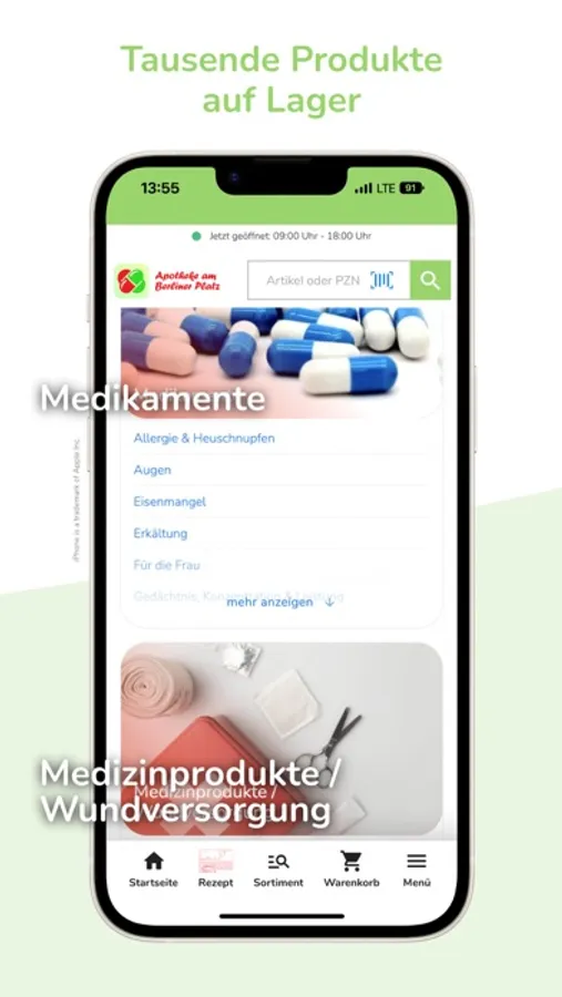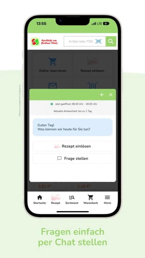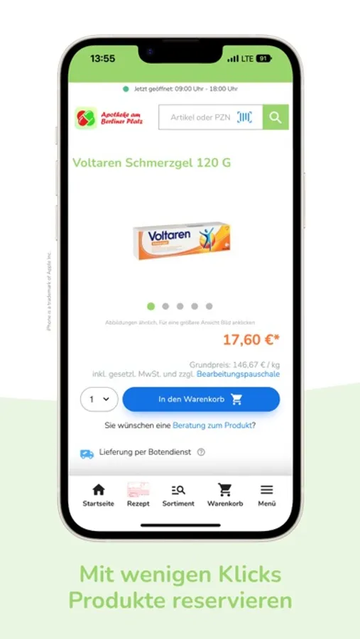 Wir bieten Ihnen über die App unser gesamtes Sortiment. Nicht sofort verfügbare Produkte bestellen wir für Sie und machen Sie in der Regel bis zum nächsten Werktag abholbereit. Gerne liefern wir Ihnen Ihre Bestellung per Botendienst direkt nach Hause.