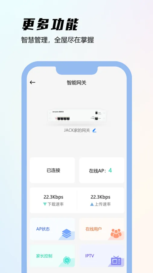 设备管理功能使您可以轻松管理您家中的智能设备。您可以查看每个设备的状态,例如在线状态、信号强度等,以及对设备进行重命名、添加备注等操作。此外,您还可以通过应用程序对设备进行远程控制,例如开关设备等。