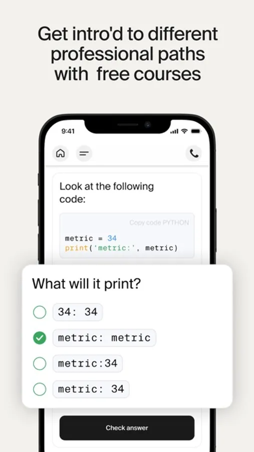 Begin with our complimentary 5-minute career orientation quiz. Tailor your learning path based on your aspirations, inherent strengths, and interests. Explore beginner-friendly courses in Python, JavaScript, HTML/CSS, SQL, Swift, Java, Git, C#, and beyond.