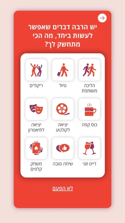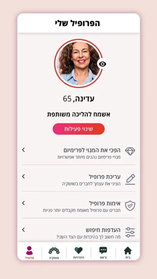 רומנטיקה, חברות, ידידות ופעילויות משותפות. התחדשנו באפשרות ליצירת קשרים חברתיים לא רק על בסיס רומנטי, אפשר לפגוש גם ידידים וידידות עם תחומי עניין דומים לשלכם, ולהזמין אותם לפעילויות משותפות בממשק המיוחד שיצרנו למטרה זו. אפשר להכיר שותפים ללכת איתם לסרטים, לספורט ולעוד מגוון פעילויות, אפילו סתם לשיחה טובה והכל עם אנשים איכותיים ובעלי נסיון חיים.