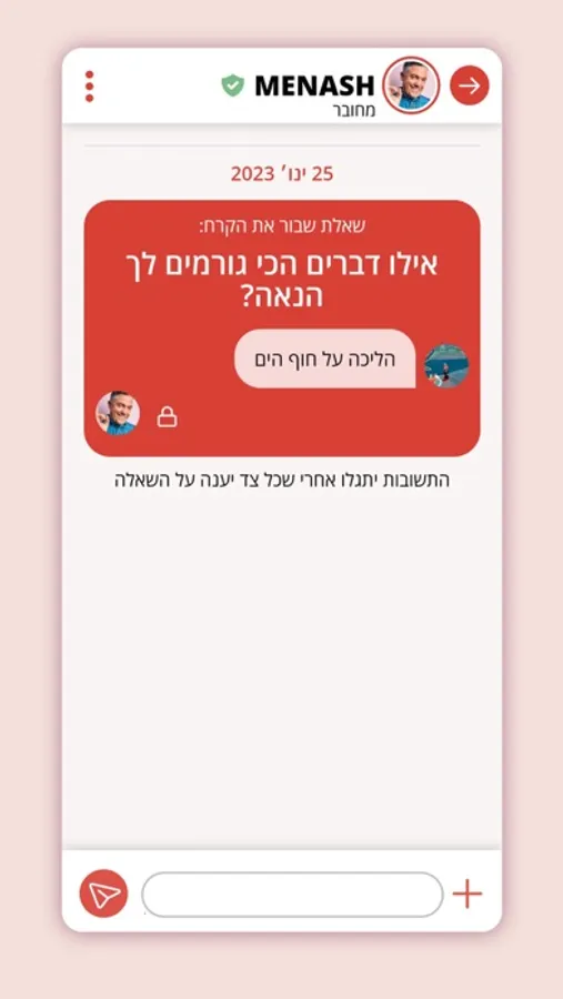בנוסף לממשק ההיכרות הנעים שלנו, תוכלו למצוא במערכת ההודעות את משחק שבור את הקרח. המשחק הזה, כשמו כן הוא, נועד לעזור לכם לשבור את הקרח ולהתחיל שיחה בקלות ובפשטות. המשחק מורכב משאלות נחמדות שתשלחו אחד לשניה וכשתגלו את התשובות, תהיה לכם נקודת פתיחה נהדרת להמשך שיחה.