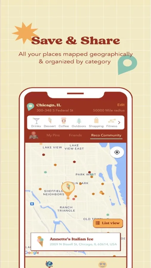 Think of Reco as a digital bookmark. When you download the app, you’ll get a map that’s uniquely yours and ready to be filled with all of your favorite spots. Easily categorize and tag locations with specific keywords and phrases to quickly access the places you want, when you want them.