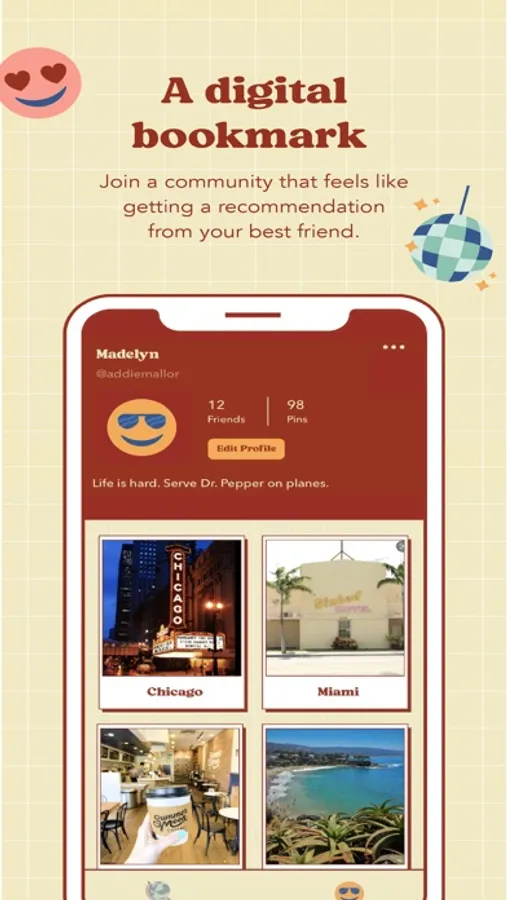 An app built to save and share the places you love, recommend, and want to try in an organized and geographical way. No more spreadsheets, scrolling your notes app, or texting that one friend who visited.
