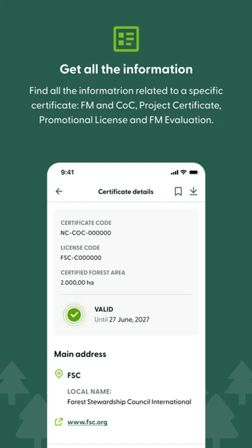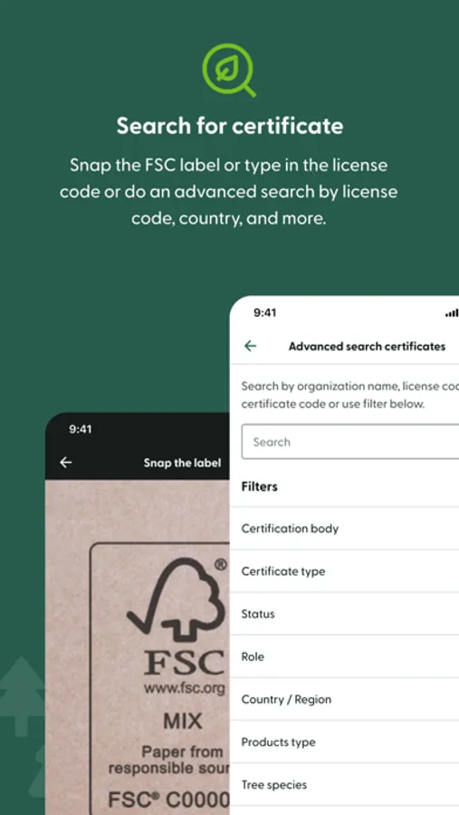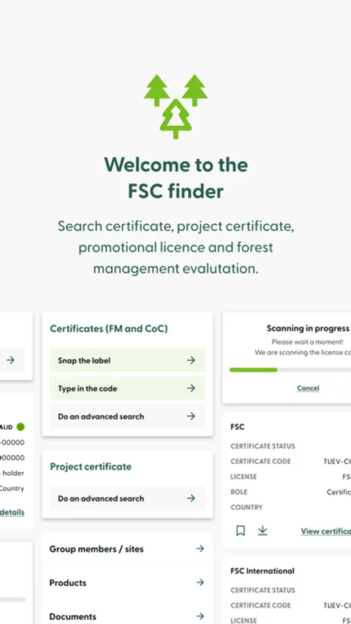 The app will help you to find all the information related to a specific certificate: FM and CoC, Project Certificate, Promotional License and FM Evaluation just to snap the FSC label or type in the license code.