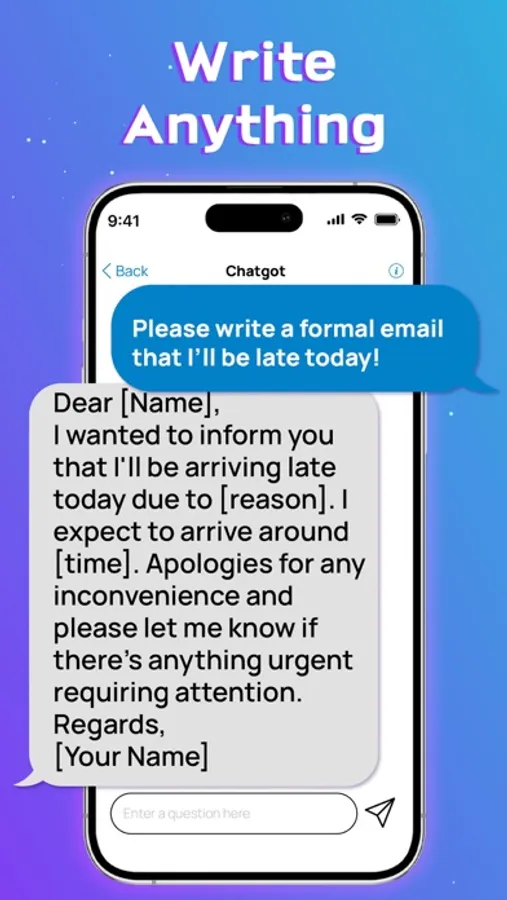 Emails, Dating Icebreakers, Blog Articles, Poems and whatnot. You can make Chatgot write anything you want. Just tell Chatgot what tone what length and the main points to address and Chatgot will take care of the rest!