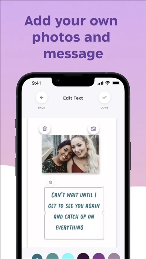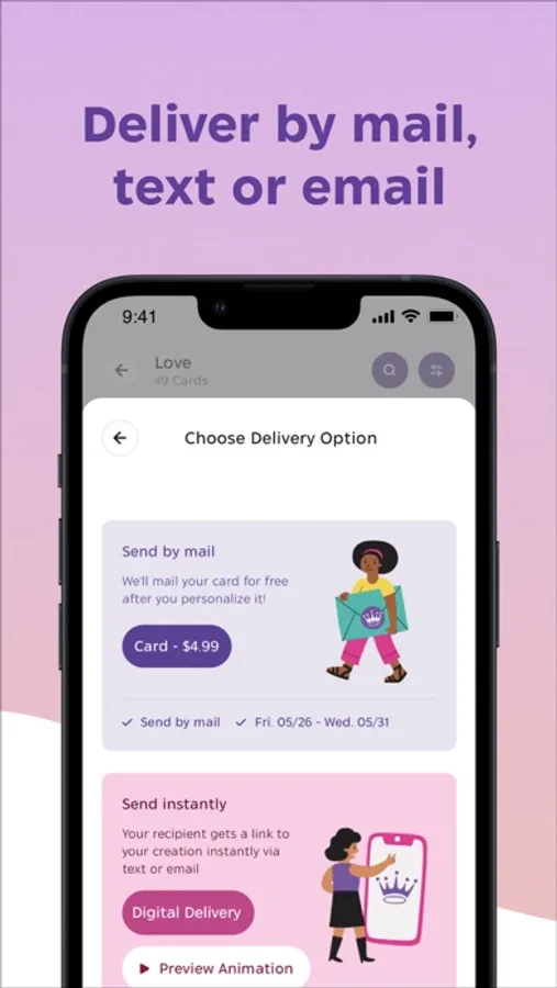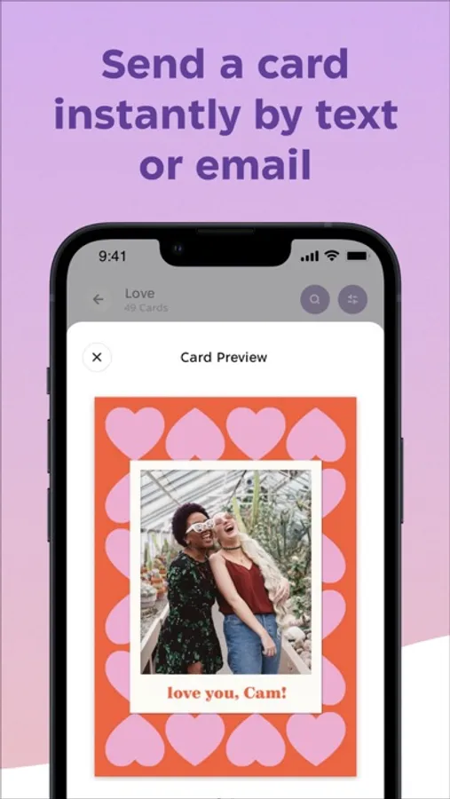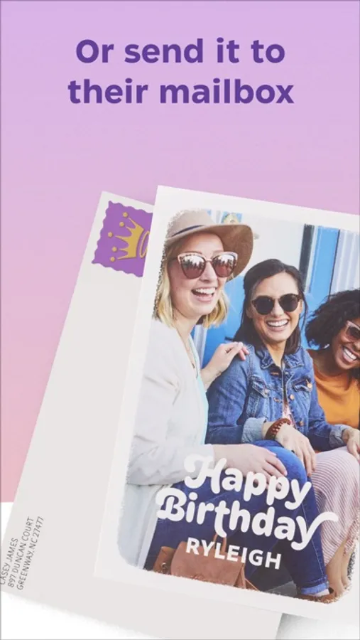 • Personalize a paper card and send it from your phone to their mailbox—postage included