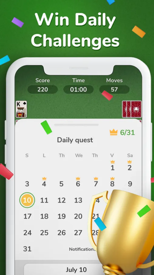 This version of Spider Solitaire is the most interesting, artistic, and user-friendly you've ever played. It offers daily challenges and goals that you can complete to earn trophies and keep your brain sharp. The more puzzles you solve, the more trophies you earn.