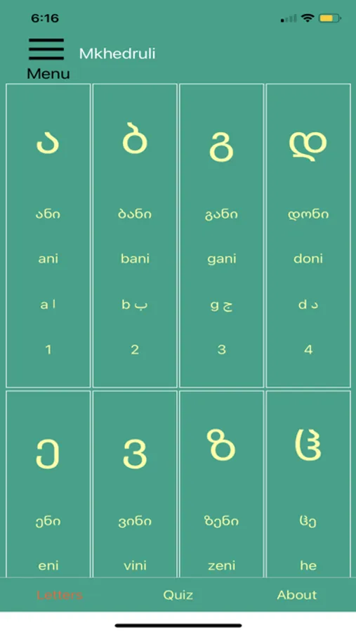 This app can help you get to know the Georgian alphabet Mkhedruli, as well as the two historical Georgian alphabets: Asomtavruli and Nuskhuri.