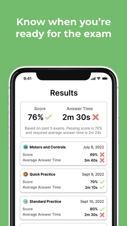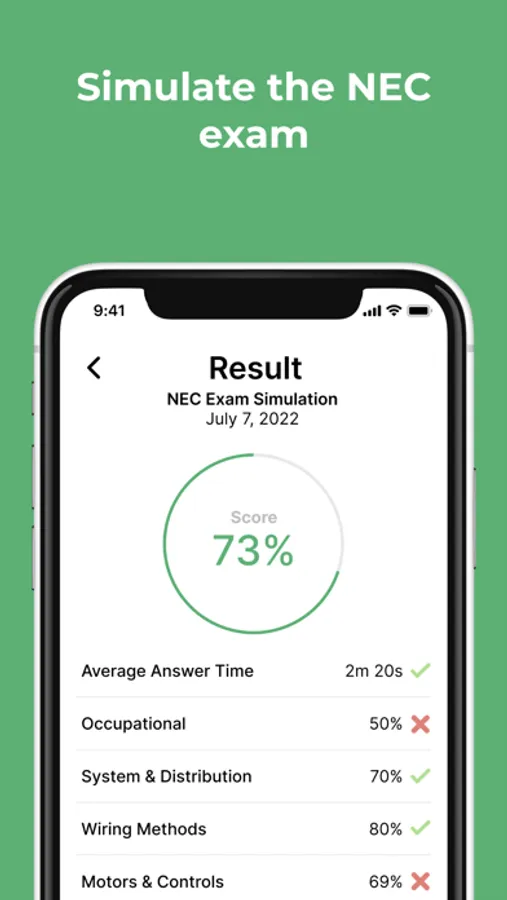 See how you do on the actual NEC Exam by simulating it on the app. We design the curriculum based on your State. For example, if you’re doing the California exam, we provide you 100 questions, distributed & weighed similarly to exam, and allocate 4.5 hours for completion. You’ll be able to see what sections you did well on, sections that need improvement, and your average answer time.
