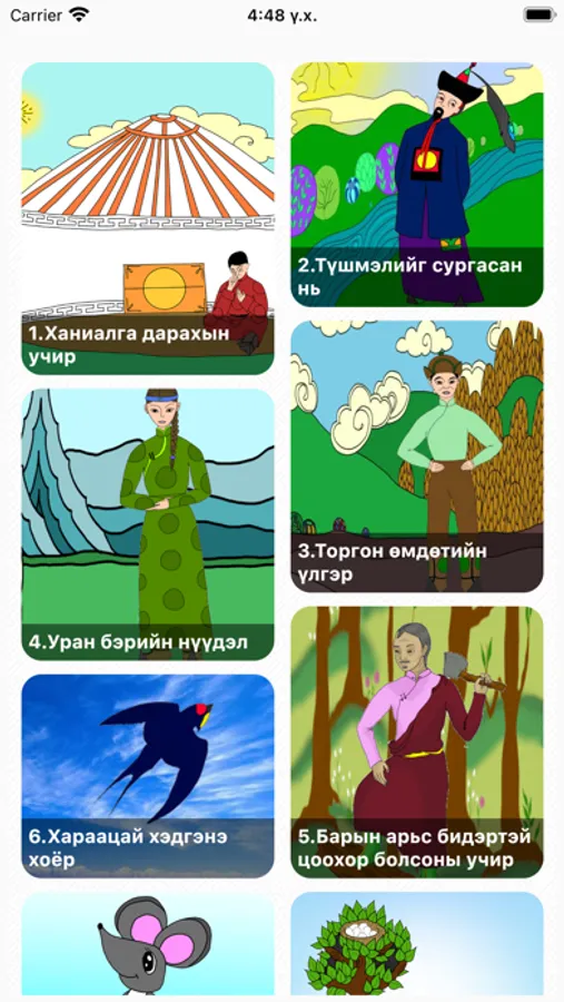 Бид энэхүү аппликэйшнийг бүтээхдээ Монгол үндэстний эрхэмлэн дээдэлж, уламжлан баяжуулсаар ирсэн эх хэл, түүхийнхээ баялаг сангаас 10 үлгэрийг сонгон авч, үндэсний бичгээр хөрвүүлэн, үлгэрийг дагаж уншсан дуу хоолойн бичлэг, өнгөт болон хөдөлгөөнт зураг, мэдлэг бататгах сонирхолтой дасгал, сорил зэргээр баяжуулан та бүхэндээ хүргэж байна.