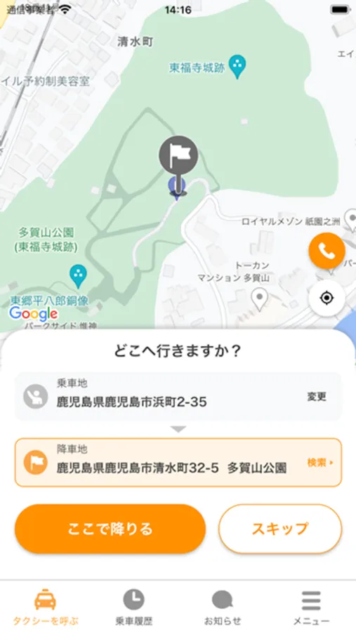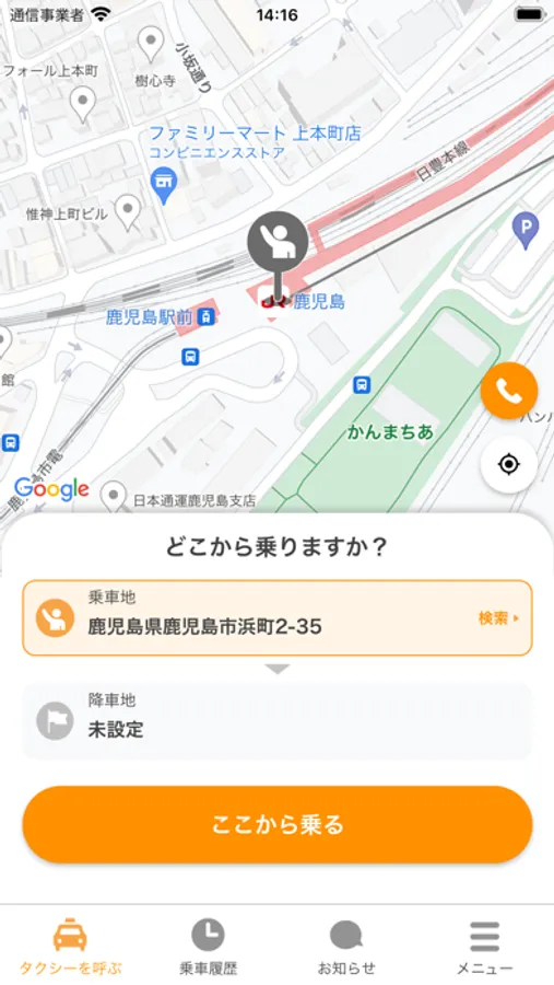 簡単な操作で、鹿児島タクシーグループ(鹿児島交通タクシー、観光タクシー、グリーンタクシー、大和タクシー、徳永タクシー、南映タクシー、南邦タクシー、日の丸交通、ひまわりタクシー、村崎タクシー)のタクシーを呼ぶことができます。