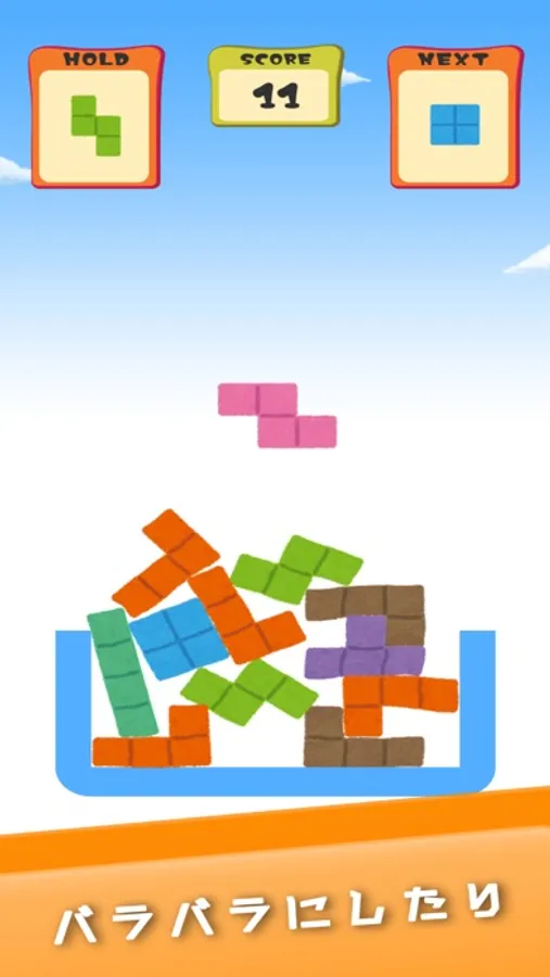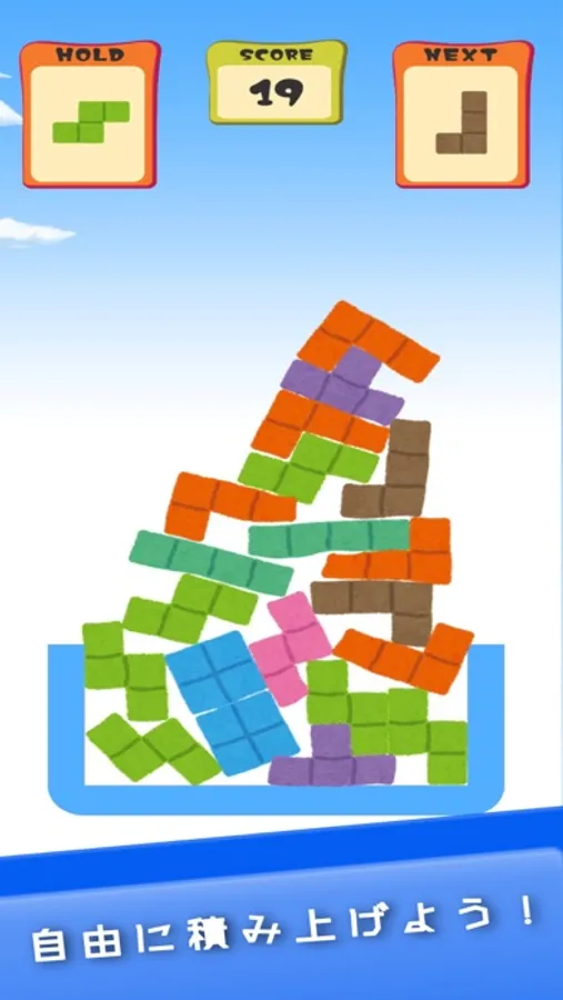 You can move the blocks left and right by swiping your finger. You can rotate in any direction by pressing the button placed at the bottom of the screen. After deciding the drop position and angle, you can drop the block by pressing the "DROP" button. Swipe up on a block to hold it. If there is already a "HOLD" block, it will be replaced with that block.
