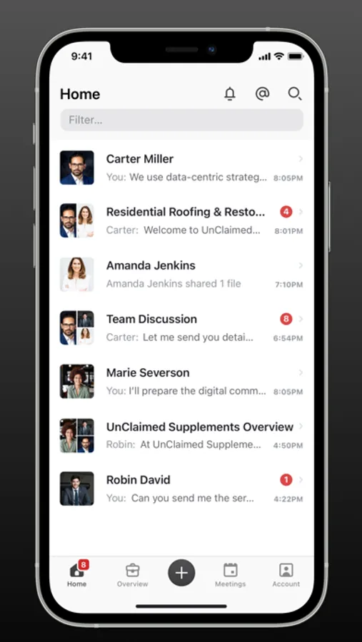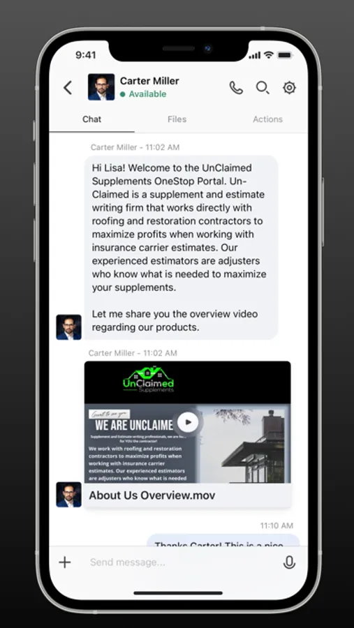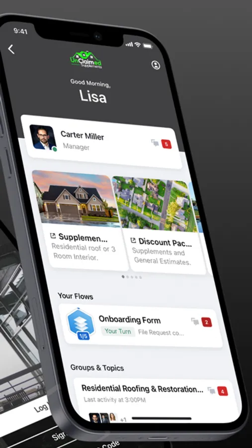 The Un-Claimed App is your one-stop destination for connecting with our team and viewing your information. Our app enables a secure, streamlined system for claim supplements and general estimating. Capabilities include chat messaging, video meetings, document sharing, calendar & task management, e-signature, private workspaces, and more for a seamless experience at your fingertips.