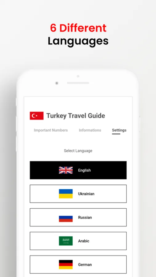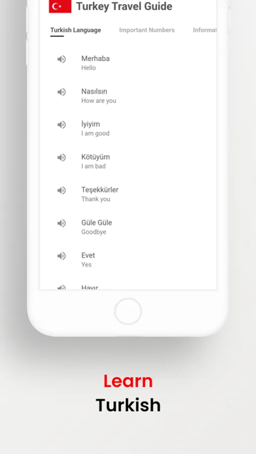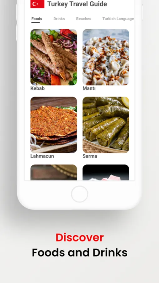 The sections in the application are: Turkey's popular cities, Turkey's popular places, Best Turkish Foods, Best Turkish Drinks, Best Beaches in Turkey, Learn Turkish Language, Informations about Turkey and Important Numbers in Turkey.
