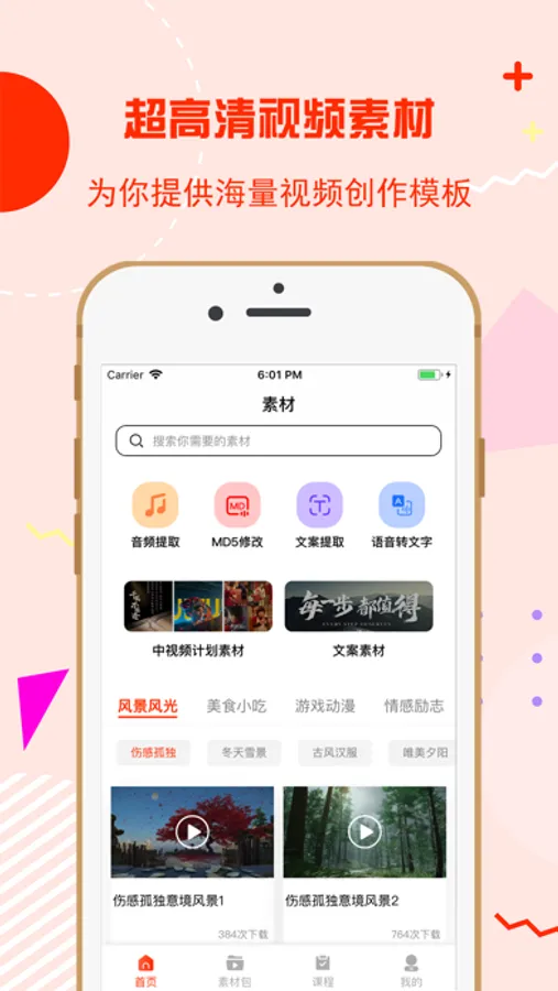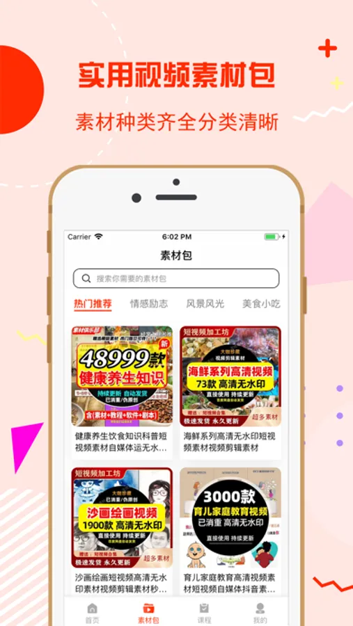 高质量视频模板,覆盖日常生活各类所需素材,包括风景风光,情感励志,美食小吃等。
